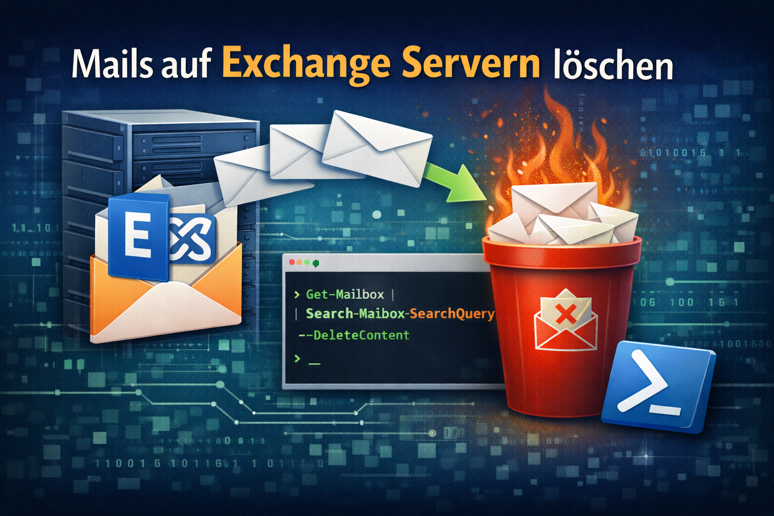 Get-Mailbox -ResultSize Unlmited | Search-Mailbox -searchQuery 'subject: Betreff der Mails die gelöscht werden sollen' -TargetFolder Suche -TargetMailbox xxx.yyy -DeleteContentMit Sorgfalt vorgehen, hier werden wirklich Mails gelöscht.